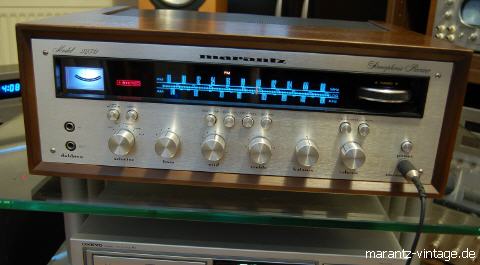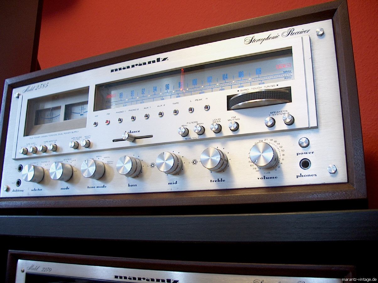 MARANTZ 2385 Sehr schöner Monsterreceiver von Marantz. Gehäuse, Woodcase und viele Teile sind baugleich mit 2500 und 2600. Leider ohne Mutingabsenkung, was bei den heutigen Quellen wie CD-Player & Co. die Lautstärkeregelung beim leisen Hören etwas erschwert.